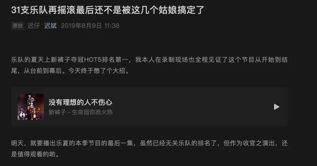 这和《奇葩说》如出一辙——语言对抗节目早就是电视台的节目类型之一;而在《乐队的夏天》播出前,乐队的粉丝本身就是一个长情而稳固的群体。